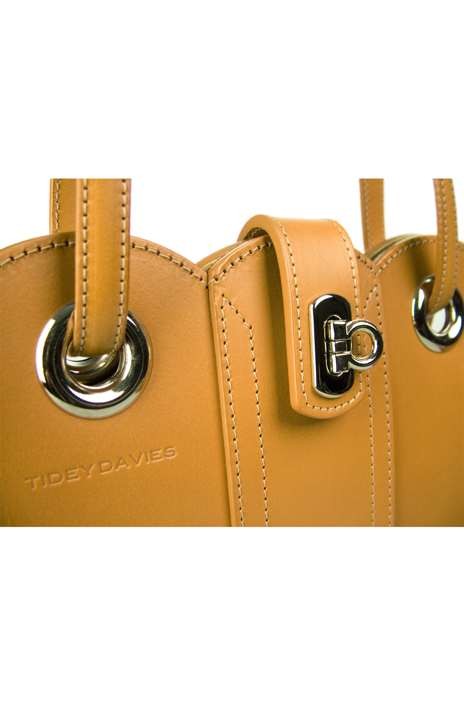 A small elegant handbag made in vegetable tanned leather with silver coloured hardware, contrasting stitch lines and suede leather lining.