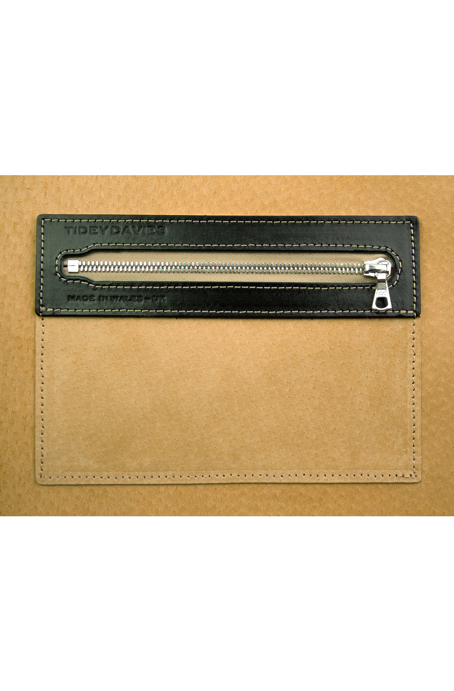 Internal medium sized zipped suede pocket with vegetable tanned leather surround and Riri zip. Flexible expanding mobile phone pocket (which will also hold a passport) and side grip for pens, flash drive etc