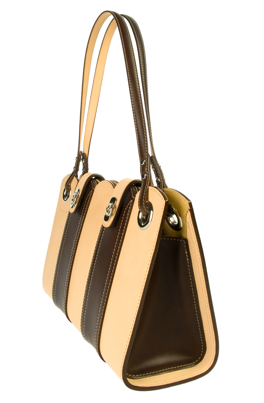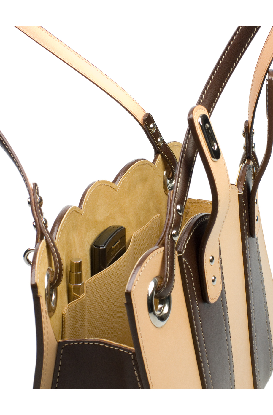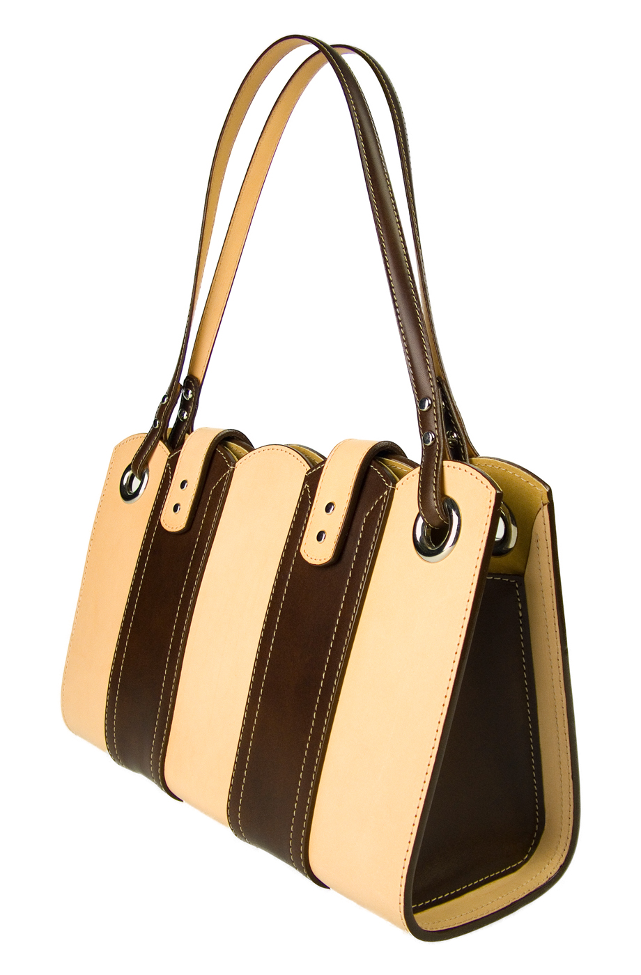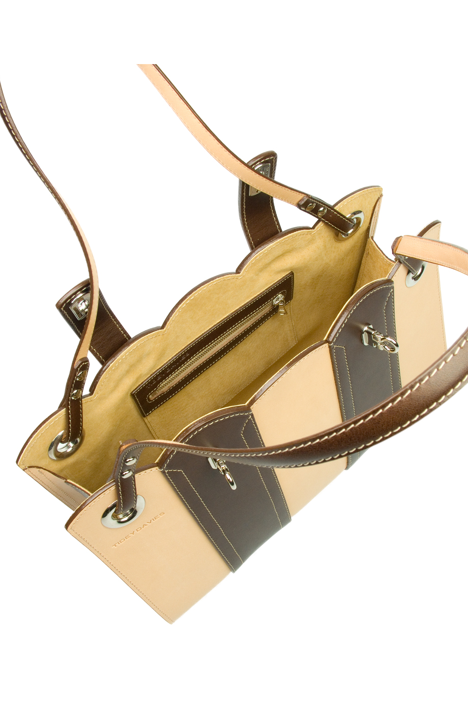Made in Brown and Natural vegetable tanned leather with silver coloured hardware, contrasting stitch lines and suede leather lining. Is designed as a handbag but straps are long enough to carry over the shoulder. N.B. Natural leather will darken over time.